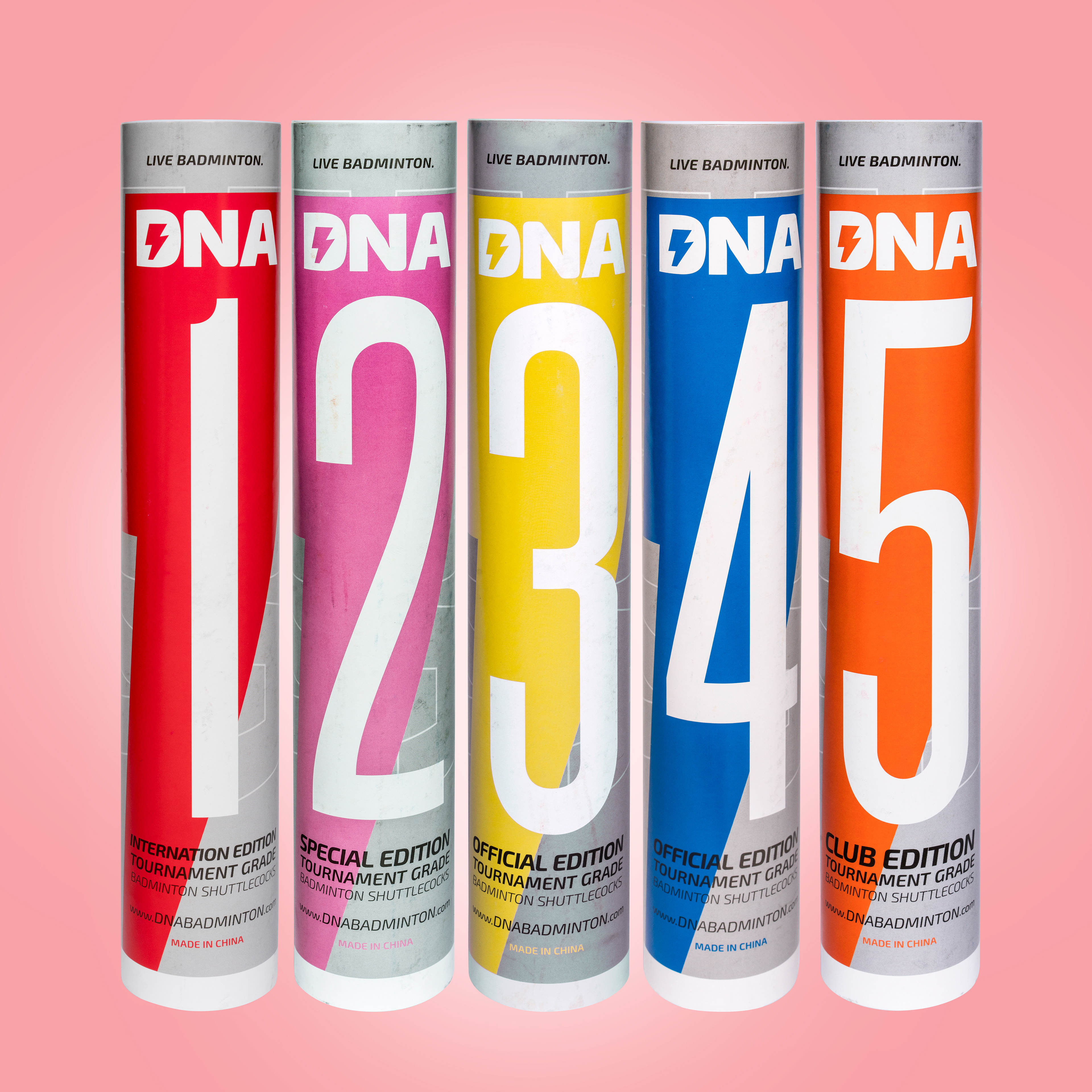This packaging design features DNA Badminton's own shuttlecocks. A number and color coded system was used to help customers identify the various shuttle grades. The design was meant to be seen from far away and be distinguishable from their competitors.