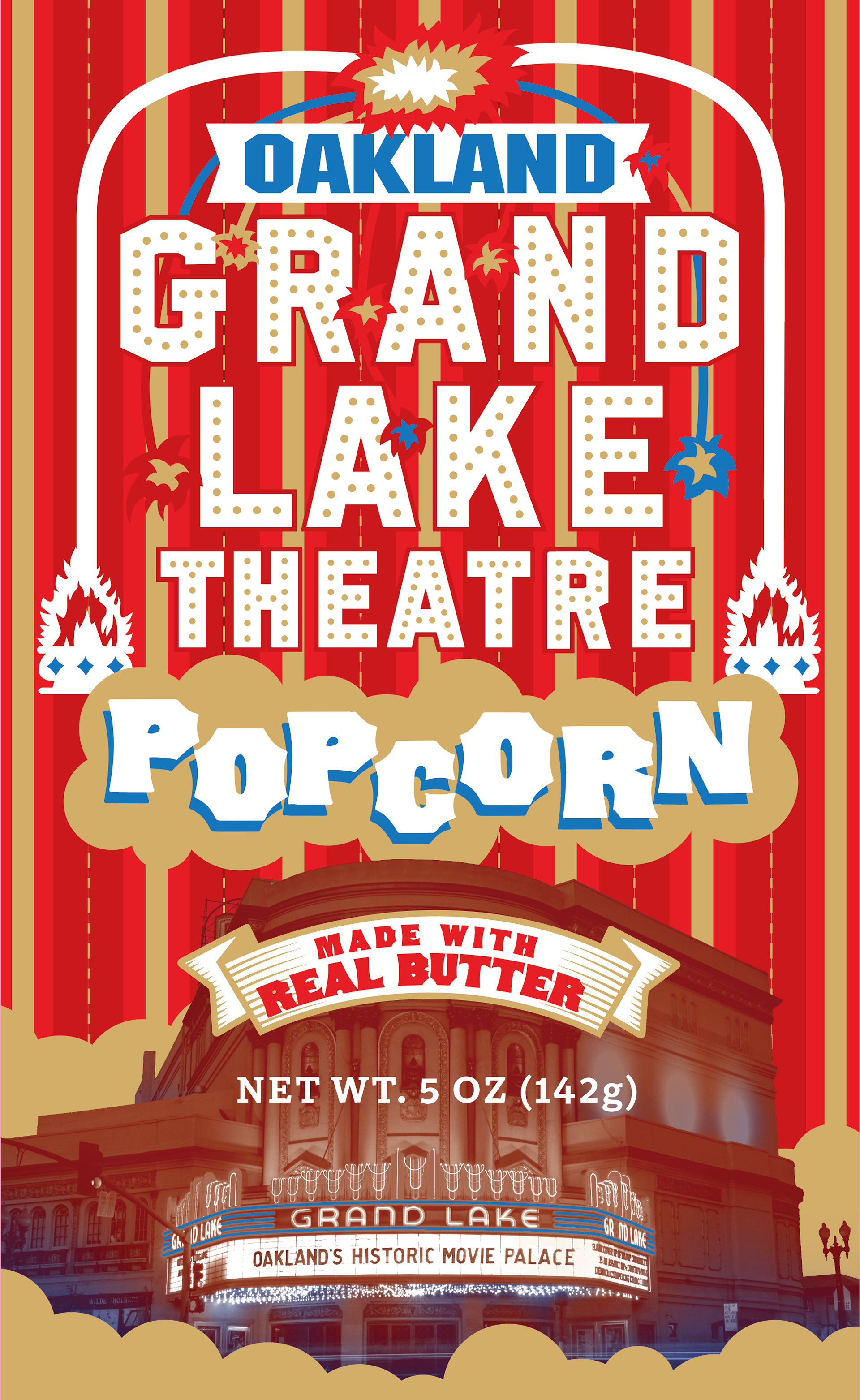 Popcorn bag design based on the Historical Oakland Grand Lake Theatre.