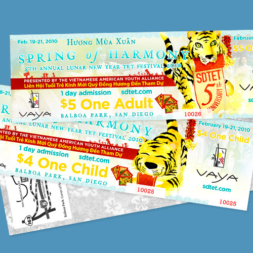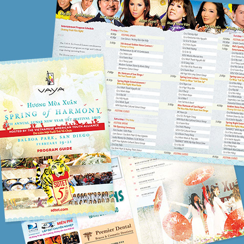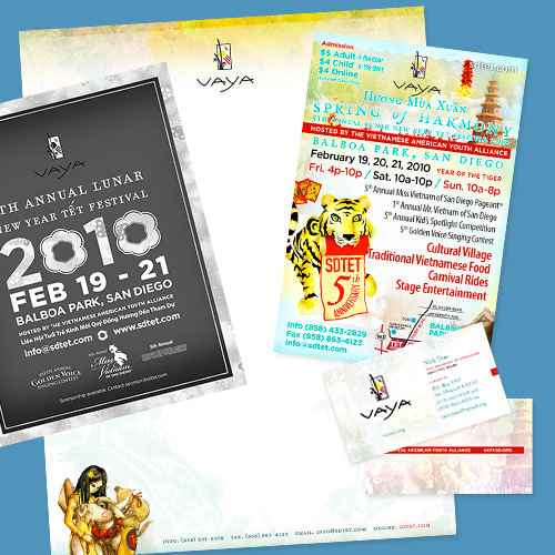 The 5th Annual Lunar New Year Tết Festival 2010 in Balboa Park, San Diego. This was our second year working with the Vietnamese American Youth Alliance (VAYA) to produce a series of marketing materials to promote the festival. The pieces reflect the central theme of the lunar new year. Marketing pieces consisted of business cards, letterhead, program guide, t-shirts, flyers, pageant calendars, and newspaper ads.