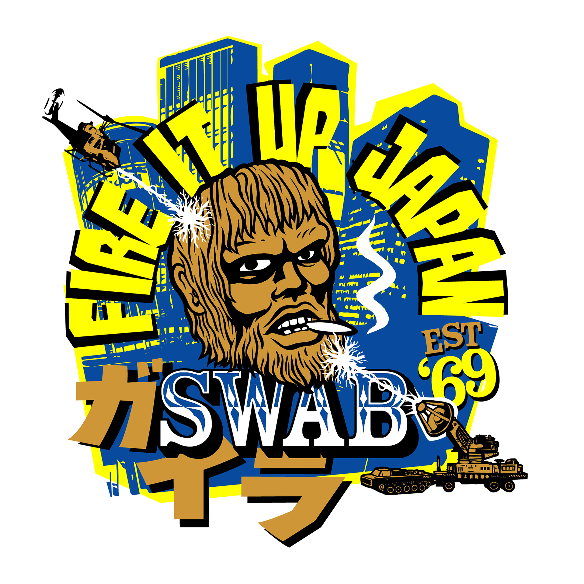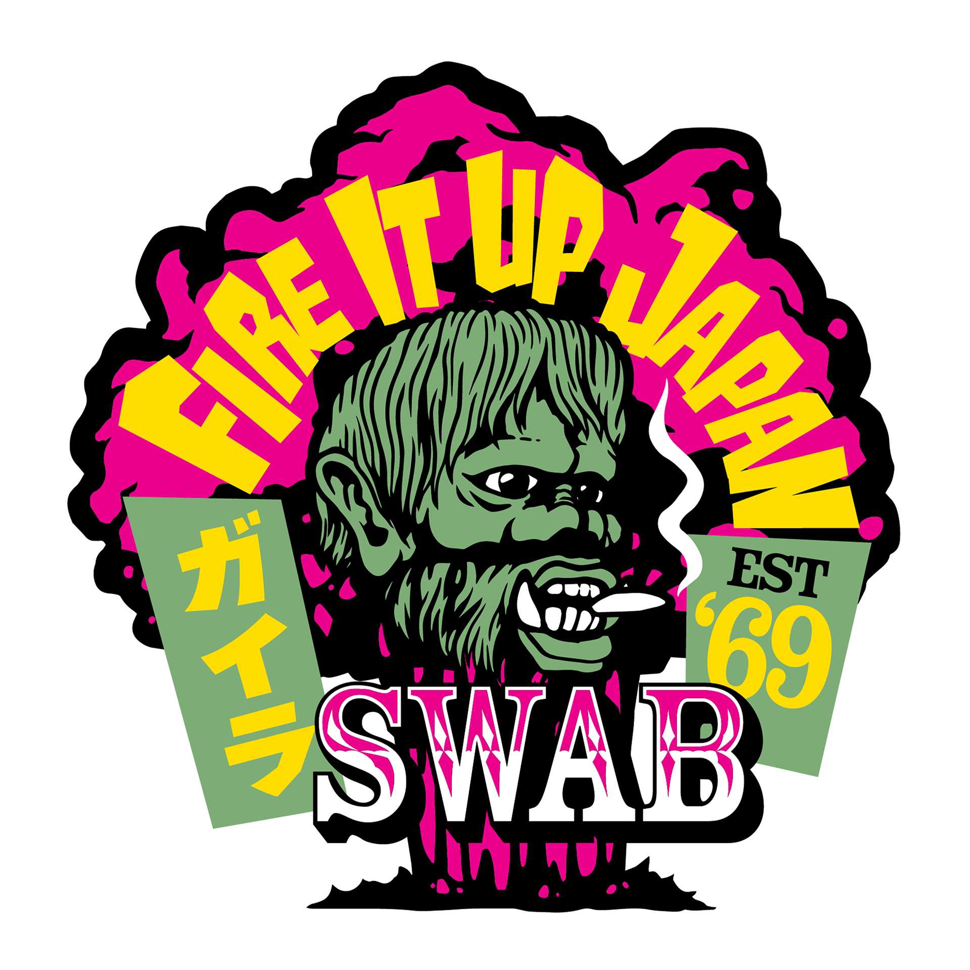 Supplemental Illustrations for the SWAB brand utilizing a retro Japanese movie theme (The War of the Gargantuas, 1966).